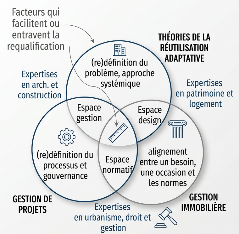 La requalification des bâtiments publics est abordée comme un problème complexe, à l’intersection de plusieurs domaines et acteurs. Le projet propose une approche systémique structurée autour de trois espaces complémentaires : gestion, design et normatif.